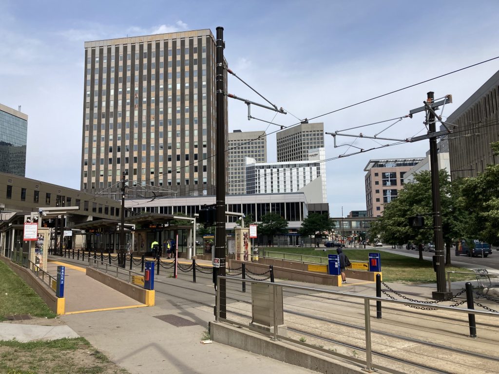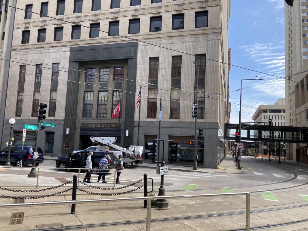 The Light Rail glides by you to the north, ringing pleasant bells to let you know its there. Across the street, what is now a parking garage, was once the offices of the Pioneer Press & Dispatch. To the south, above the skyway, there’s a mural of people, animals, and ocean and on the other side of that building you can peep a sliver of 345 Cedar where the Pioneer Press officed from 1984 to 2016. To the north, behind the 1st National Bank Building, you can also see a sliver of the Pioneer Endicott Building–St. Paul’s first skyscraper and the papers home from 1889 to 1909. In 1941, the Pioneer Press merged with the Daily News and their office was 55 E. Fourth Street, also right in front of you. When you look at Central Station, don’t forget to appreciate the various building shapes of the city you can see stretch out from a block away.