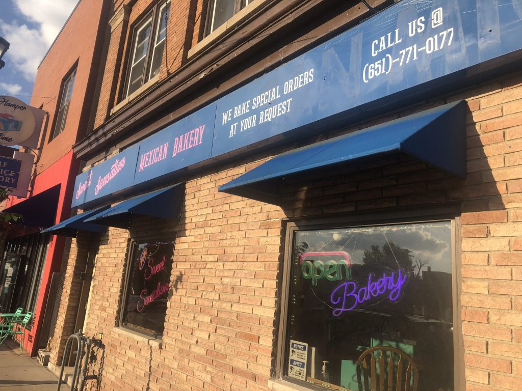In the sunlight we see a brick building with a pale pink door, and blue awnings, in pale pink writing reads “Sweet Sensation, Mexican Bakery”, and above that is a worn green, white, and red “panaderia/pasteleria” sign. There are two windows, in one blinks bright pink “Sweet Sensation”, in the other window flickers “Bakery” in bright purple; both windows have a classic neon OPEN sign and are lined with color changing twinkling lights. Looking inside the windows we see six bakery cases along the walls, filled with at least 30 different types of bread based pasties. A teal bakery counter houses small hand held American flags, ceramic decor in the shapes of cakes and tea pots, and two tall pink high top tables surrounded by two soft teal stools at each. A friendly woman wearing a disposable apron smiles from behind the counter.