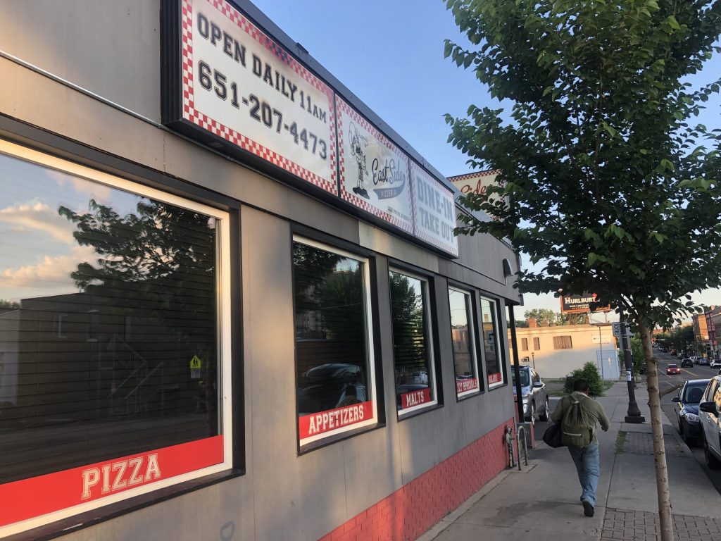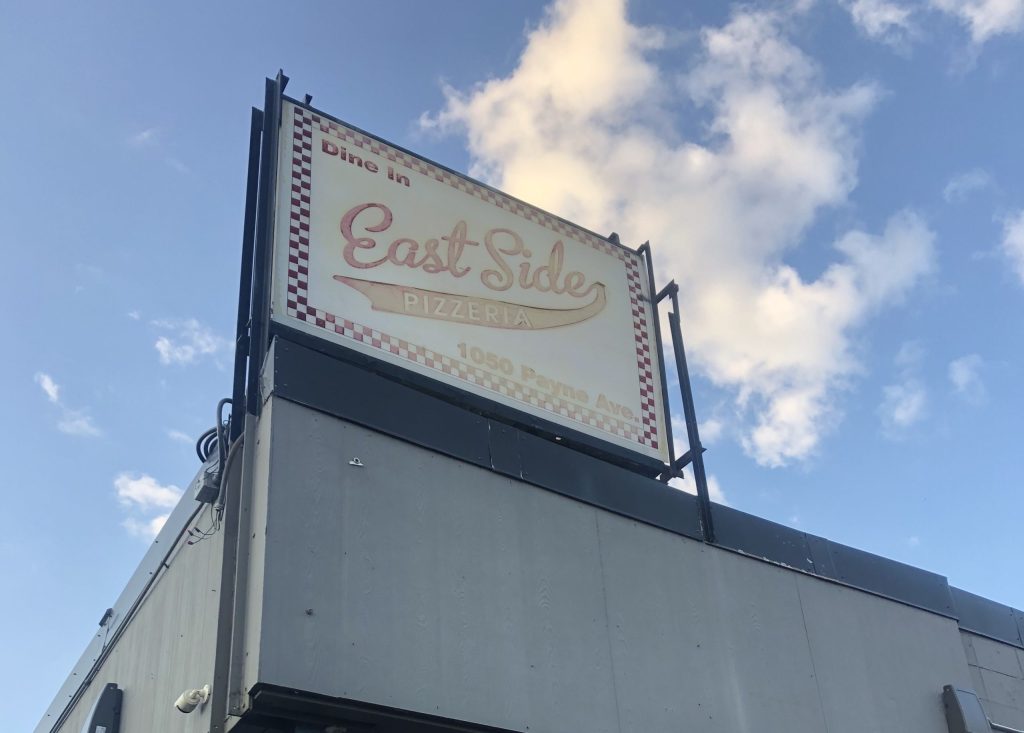 A long, grey, concrete building with a large red and white vintage-style sign atop it saying “Dine-In East Side Pizzeria”. Along the street edge of the building are 8 square windows lined with bold, red, banners that read “malts”, “salad”, “pizza” etc. To the side there is an entryway just a few concrete steps up along a black chipped handrail. Behind the double glass door entryway is a service counter, a long line of booths along the front windows for diners to eat, and countless souvenirs above the entry door.