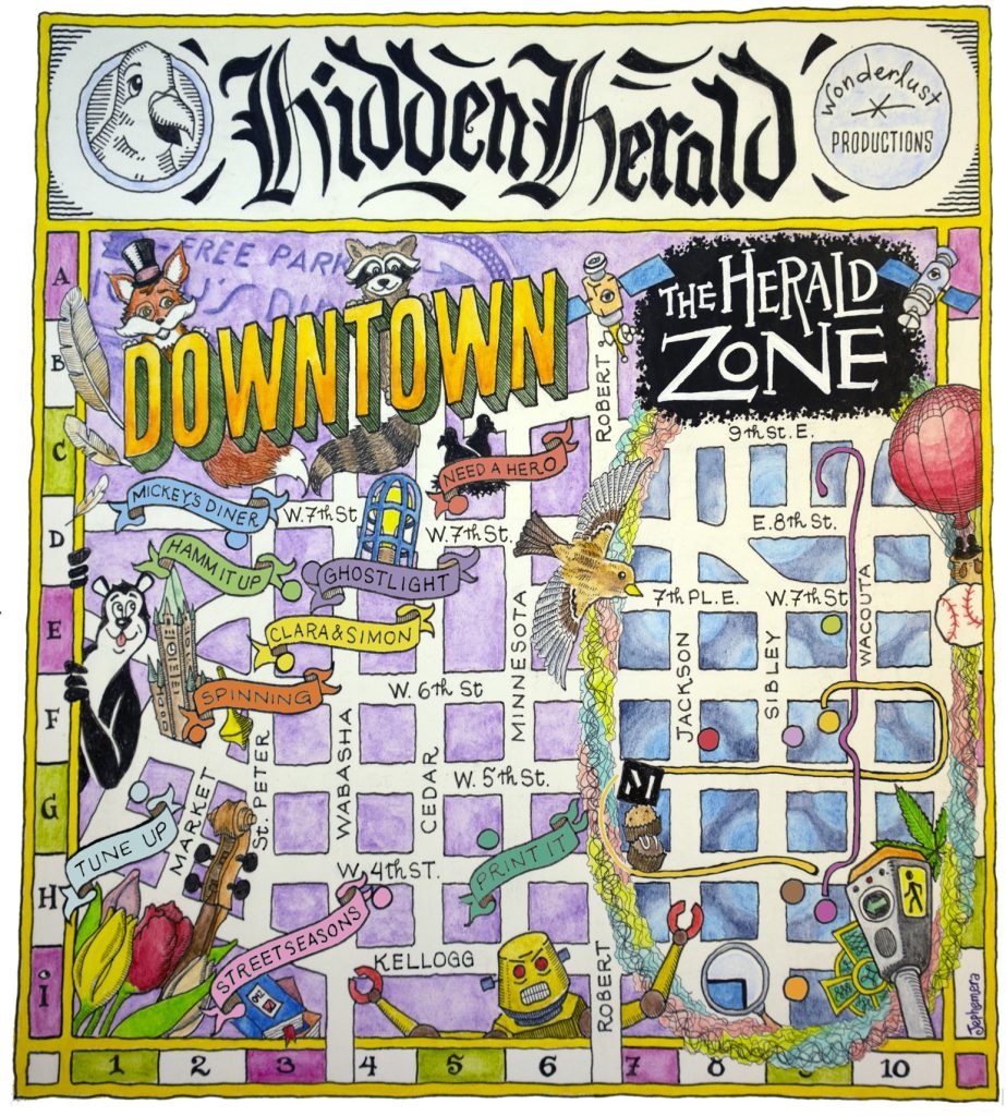 The second season returns with two kid-oriented series; an adult scavenger hunt; some twisted Twilight Zone-type series, St. Paul’s gangster history, the Hamm’s Beer Bear, and more. This year, we’re expanding and you can find Hidden Herald stickers in Downtown, Lowertown, around Lake Phalen, and up and down Payne Avenue.