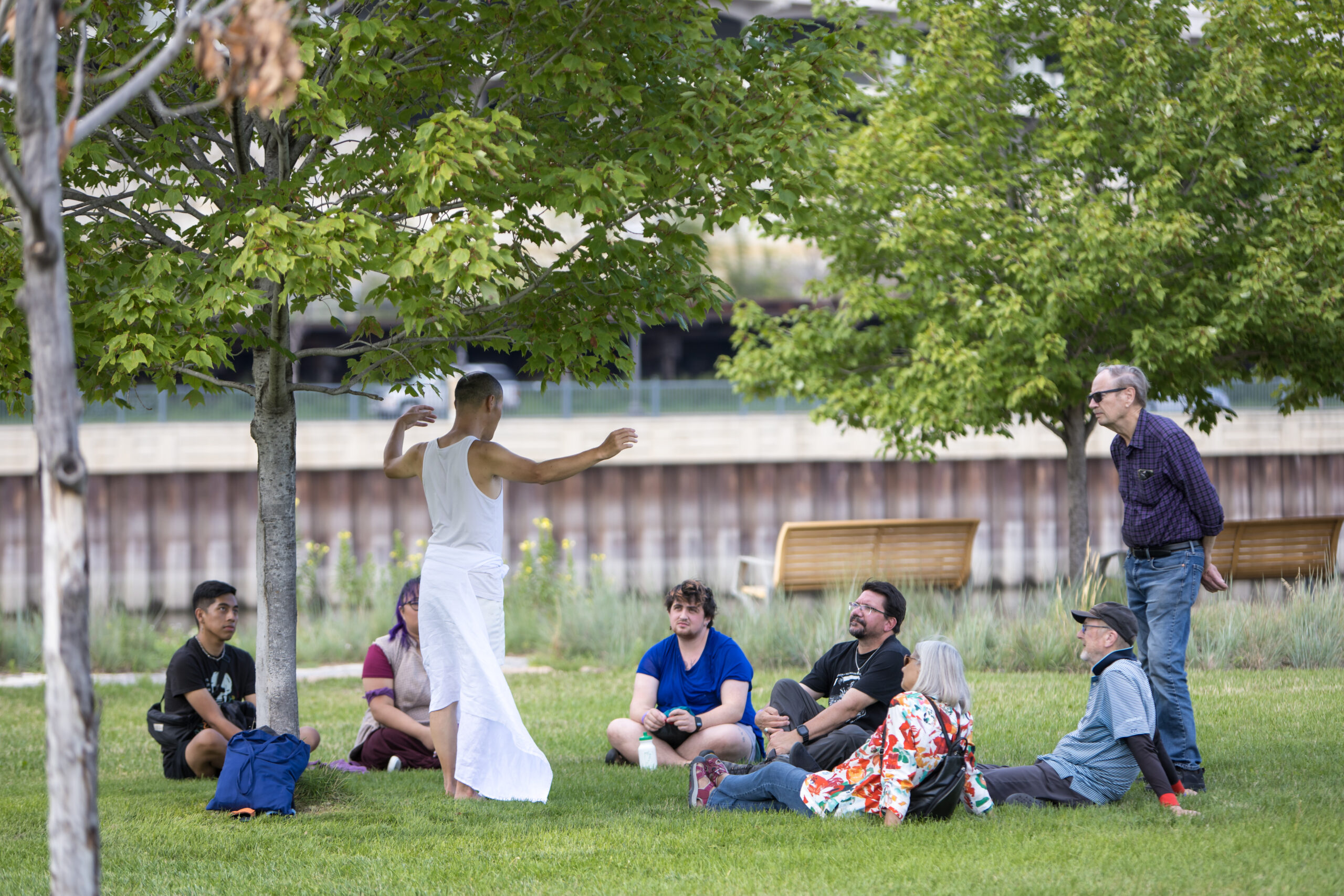 Created and directed by Leah Cooper with stories created and performed by Masanari Kawahara, Antonio Duke, Marcela Michelle, and Laurel Armstrong. Guided and co-written by Megan Kim, Adam Whisner, Sophie Javna, and Yana Landowne (co-director), with additional co-writing by Ernest Briggs and Shante’ Sojourn Zenith. Costume design by Andrea Gross. Music composition by Becky Dale and Sophie Javna. Herbal offerings by Sophie Javna. Research assistance by Lacey Mamak.
