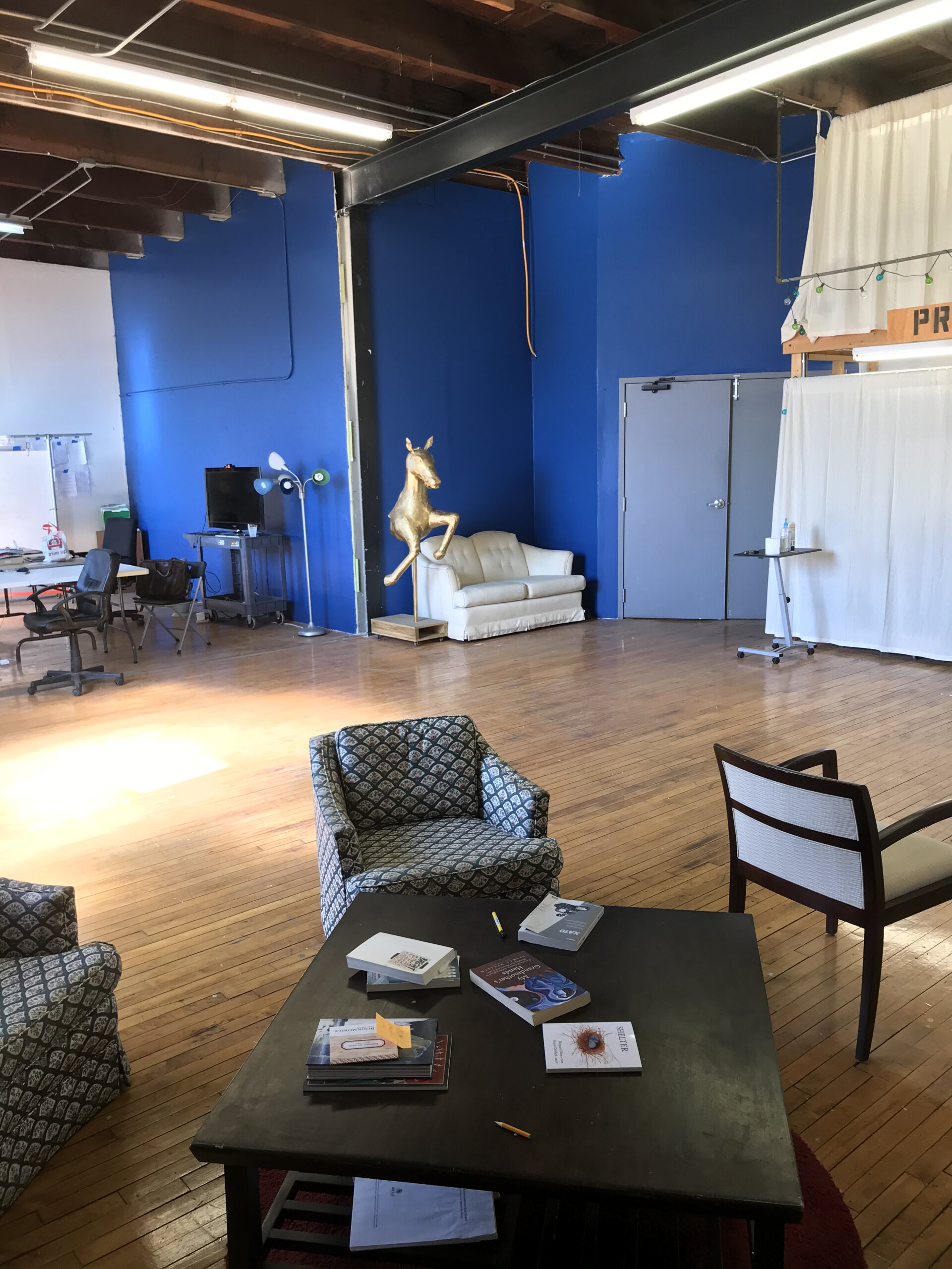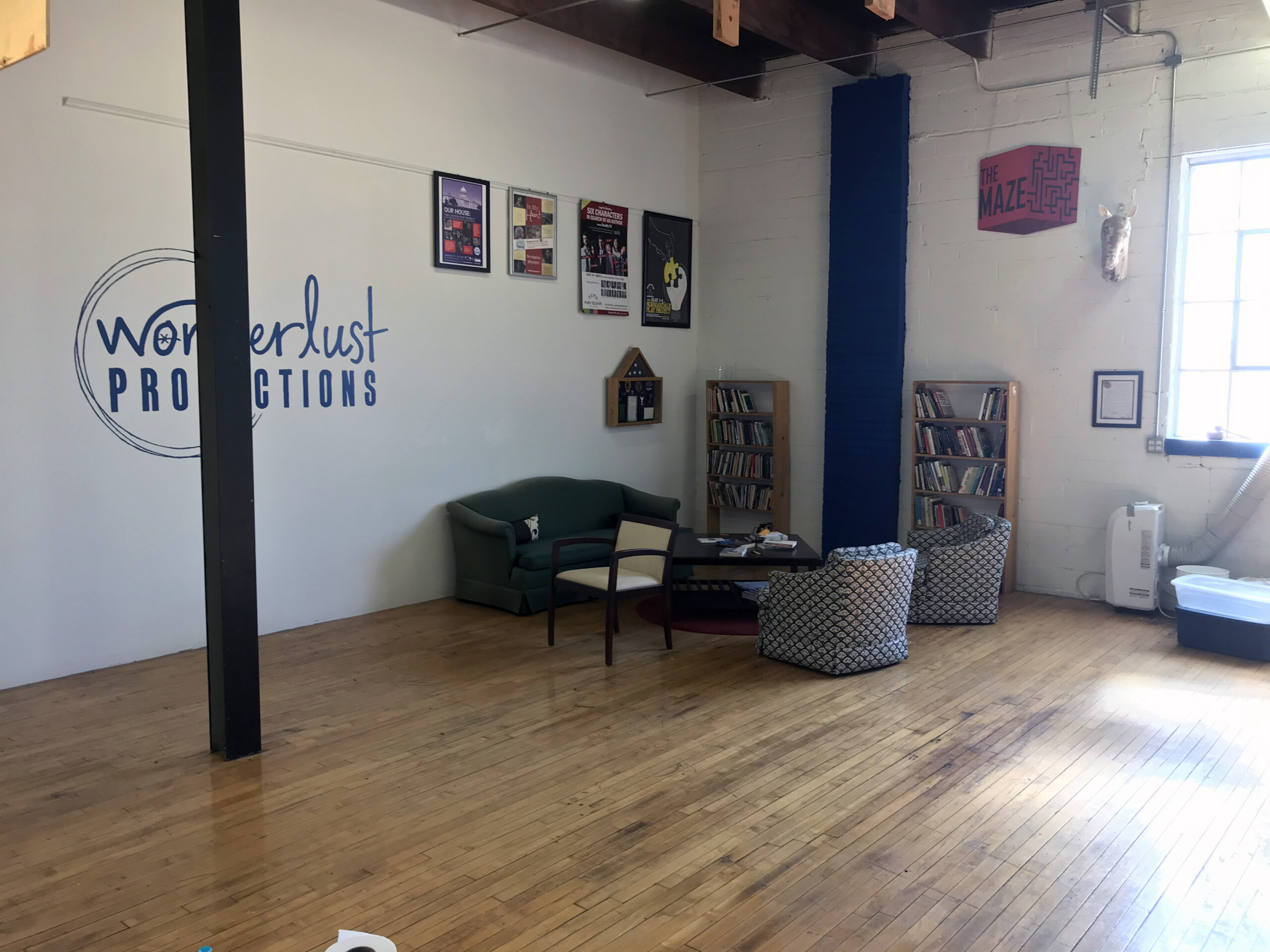 Our studio includes a large open ‘rehearsal’ space, an office space, a kitchenette, and a lounge area. There is approximately 20’ x 30’ of open space, with a column in the northwest corner (but not centered). The ceilings are approximately 20′ high with exposed beams; the studio faces east with large windows, filling the room with natural sunlight. The floor is hardwood. Capacity is 35 people.